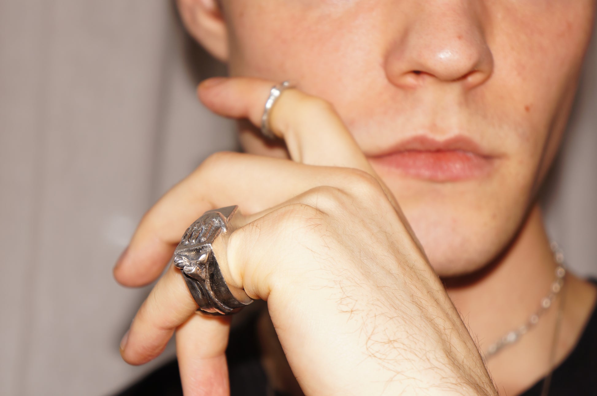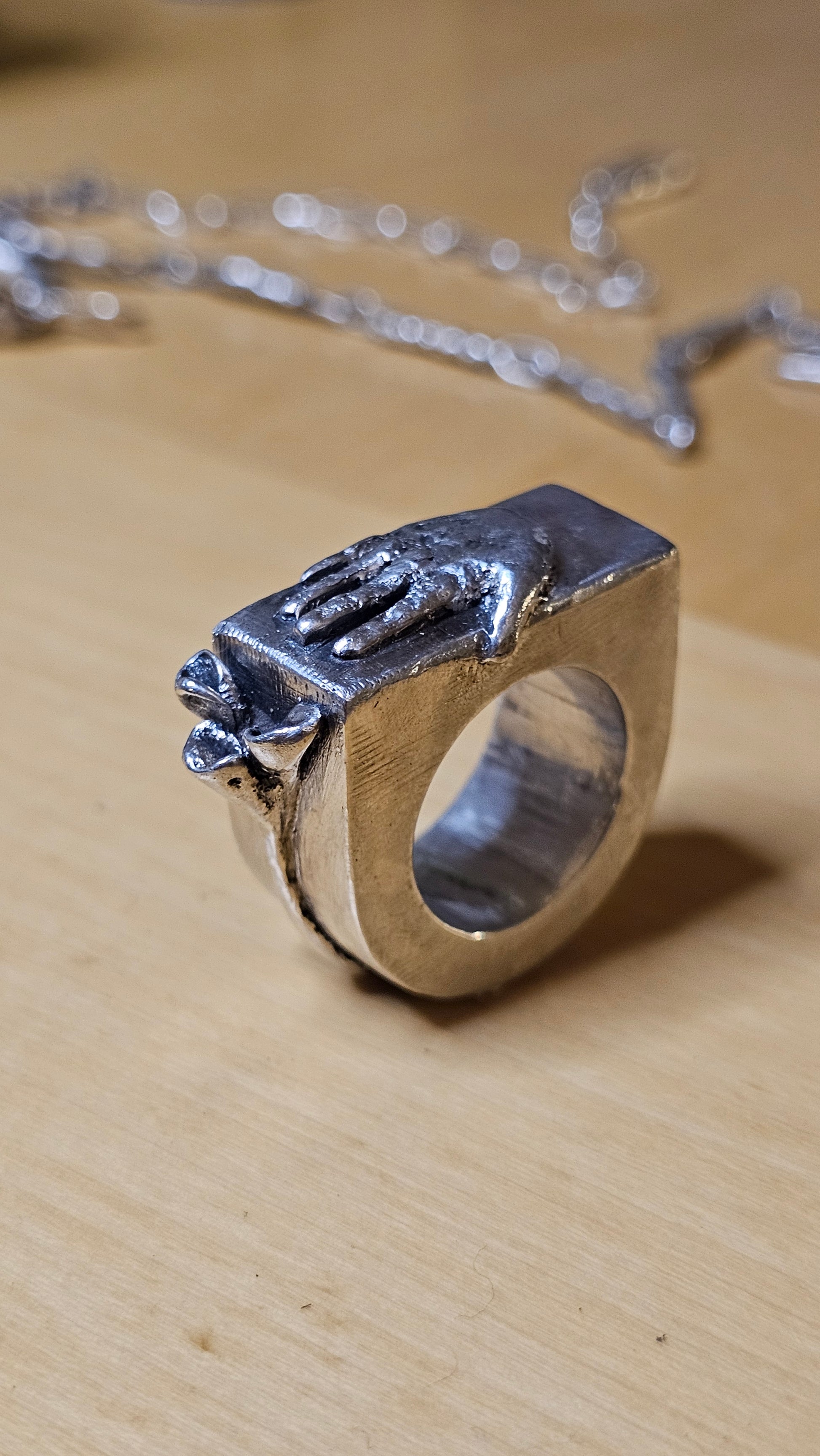 This ring is made from sterling silver, the piece is hand-carved from wax and then cast in metal. This piece is unique and will not have a replica.