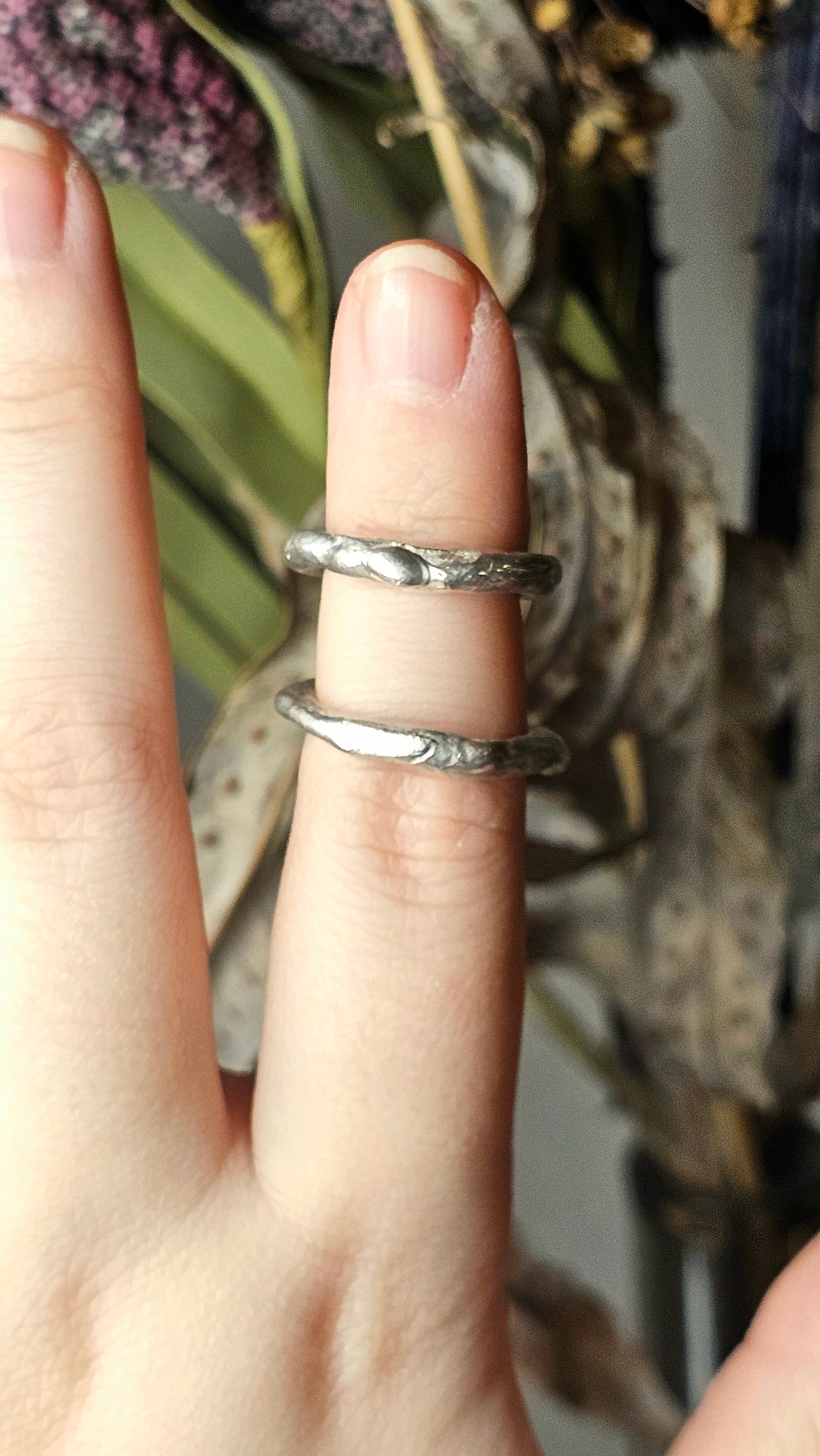 This ring is made from sterling silver, the piece is hand-carved from wax and then cast in metal. This piece is unique and will not have a replica.