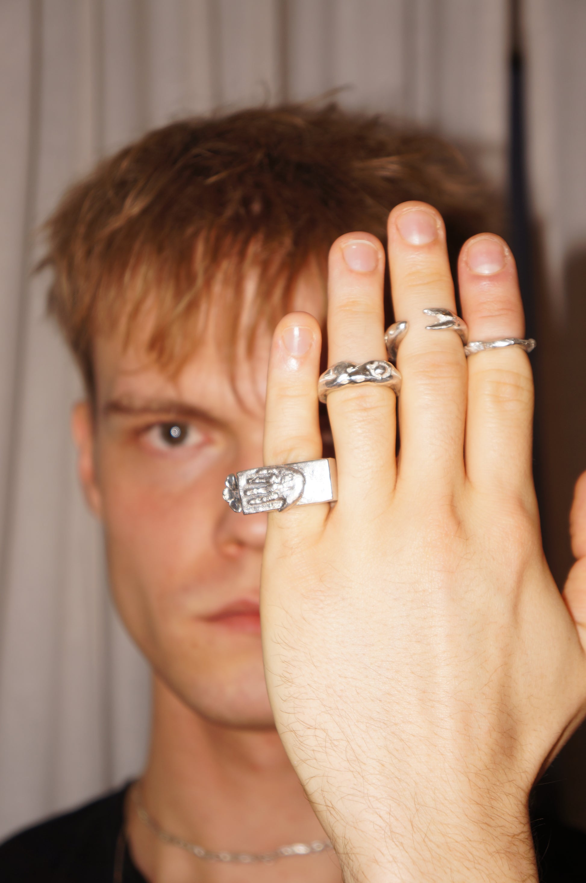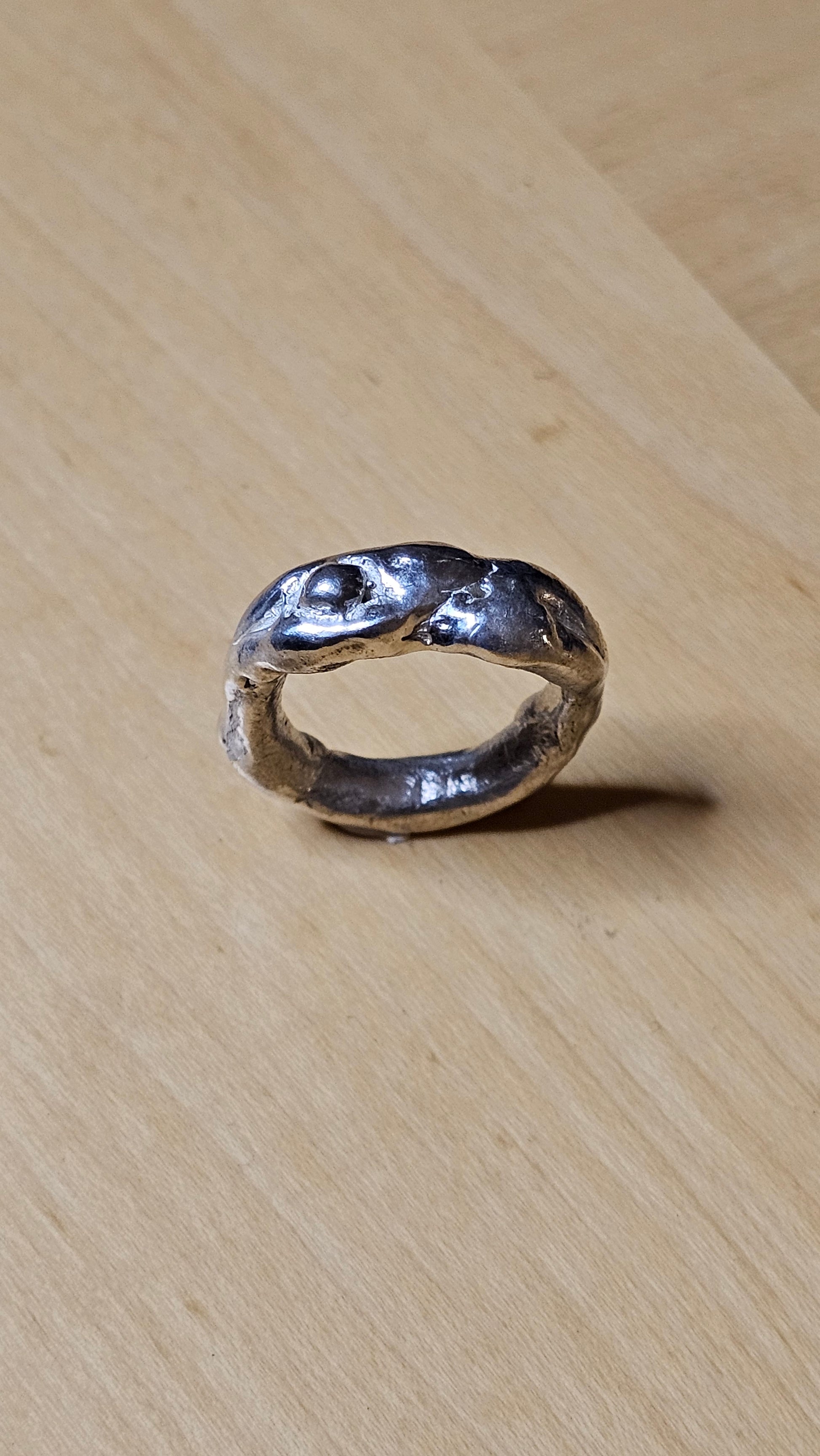 This ring is made from sterling silver, the piece is hand-carved from wax and then cast in metal. This piece is unique and will not have a replica. This one has an abstract person's body wrapping around the band or whatever you want it to be ;)